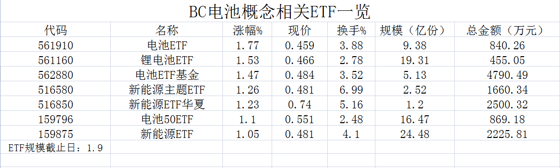 今日,整个光伏板块继续反弹,其中,光伏主要分支BC电池概念走势最为强劲,这也令多只电池ETF涨幅靠前,包括电池ETF(561910)在内的4只电池相关ETF半日涨幅超过1%。