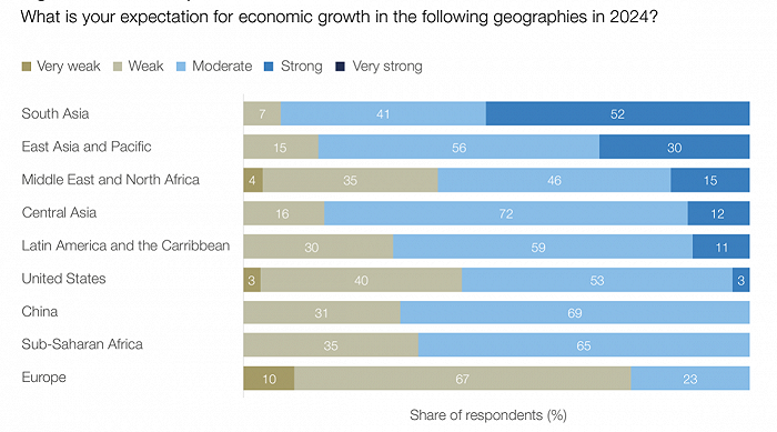 尤其是南亚和东亚及太平洋地区(不含中国)的经济活动被经济学家们认为最为活跃,52%的受访经济学家预计南亚经济增长强劲,仅有7%的受访经济学家认为该地区经济疲软。亚洲地区的例外则是中国。展望报告指出,受制于消费疲软、工业生产下降以及房地产困局,中国2024年的经济反弹将面临压力。