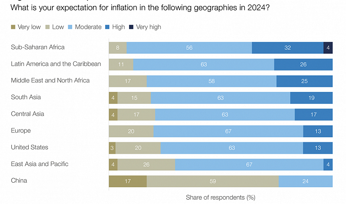 报告也指出,下降的通胀预期仍然容易受到大宗商品市场和供应链冲击的影响,包括红海区域的混乱、地区冲突升级以及气候极端变化的加剧将对物价造成压力。例如仅厄尔尼诺现象的到来就足以将全球粮食价格推高9%以上。另一个注意点则是超过76%的受访经济学家认为中国的通胀预期低或极低。