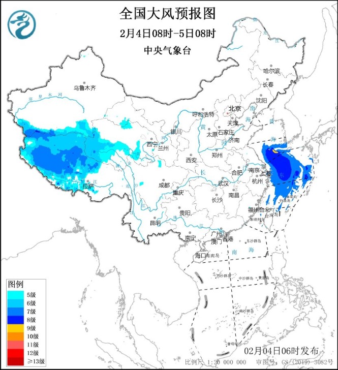 发布大风蓝色预警:预计,2月4日08时至5日08时,新疆南疆盆地、西藏北部和西部、青海西部、台湾岛等地将有5~7级、阵风8级的大风;黄海南部海域、东海大部海域将有7~8级、阵风9级的大风,其中黄海南部部分海域风力可达9级、阵风10级。
