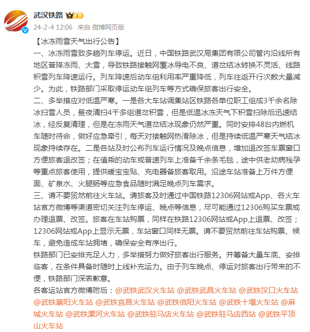 武汉铁路官方微博4日发布消息称: